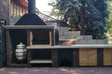 Вы можете разместить модульные печи барбекю на открытом воздухе, так как фасад покрыт декоративной штукатуркой, которая защитит барбекю от внешнего воздействия окружающей среды. Помимо этого можно осуществить установку элементов для приготовления пищи в беседке или на террасе с навесом с помощью переходника на сэндвич трубу. Такой переходник позволит безопасно вывести дымоход сквозь кровлю. За счет двойной трубы с утеплением(сэндвич) вы можете осуществить отвод дымовых газов  и увеличить тягу воздуха, что поспособствует большей теплоотдаче от углей или дров. Комплекс из бетона может состоять из мангала, печи под казан, тандыра, столика с мойкой и углового столика.